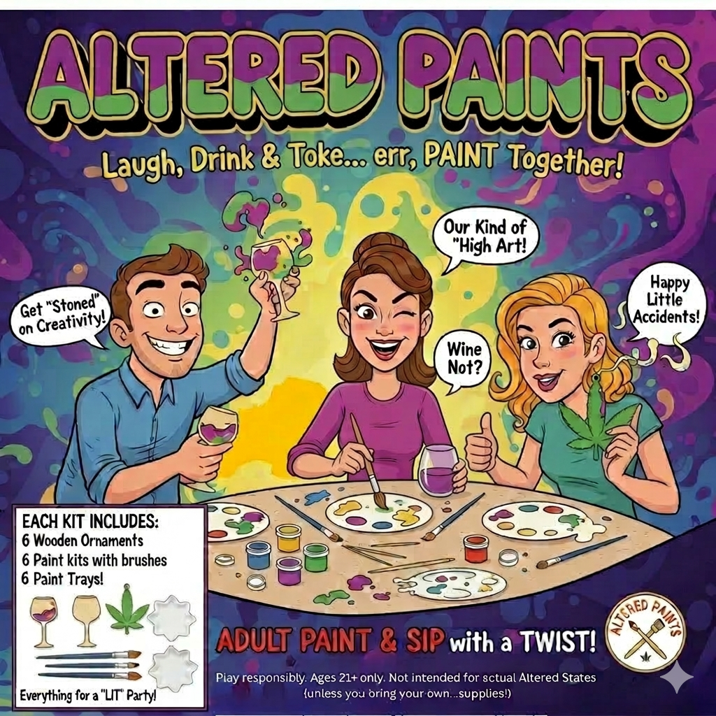 Whether you’re hosting a rowdy craft night or vibing solo, we provide everything you need to ditch the rules, embrace the whimsical, and laugh, drink & toke... err, PAINT together!