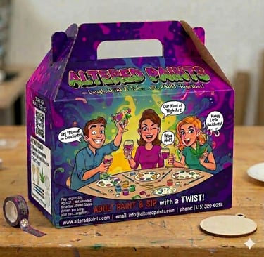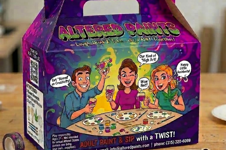 A nostalgic, oversized cardboard carrier holds the magical contents of your choosing. The Surprise "Toy": No plastic figurines here. Each box contains a pack of "I Tried" stickers to wear proudly once the wine/weed kicks in and the painting starts looking... abstract.