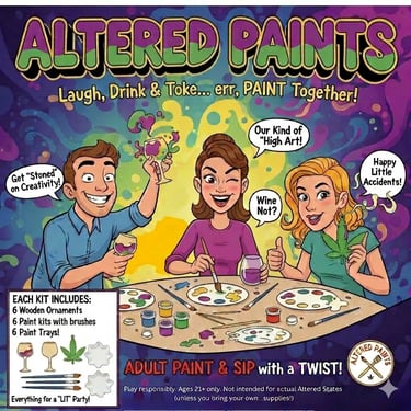 Each kit is a high-energy party in a box, featuring your choice of three curated wooden ornaments—from our "Vine & Vibes" wine collection or our "High-Res" weed-themed sets—alongside professional paints, brushes, and exclusive surprise gifts.